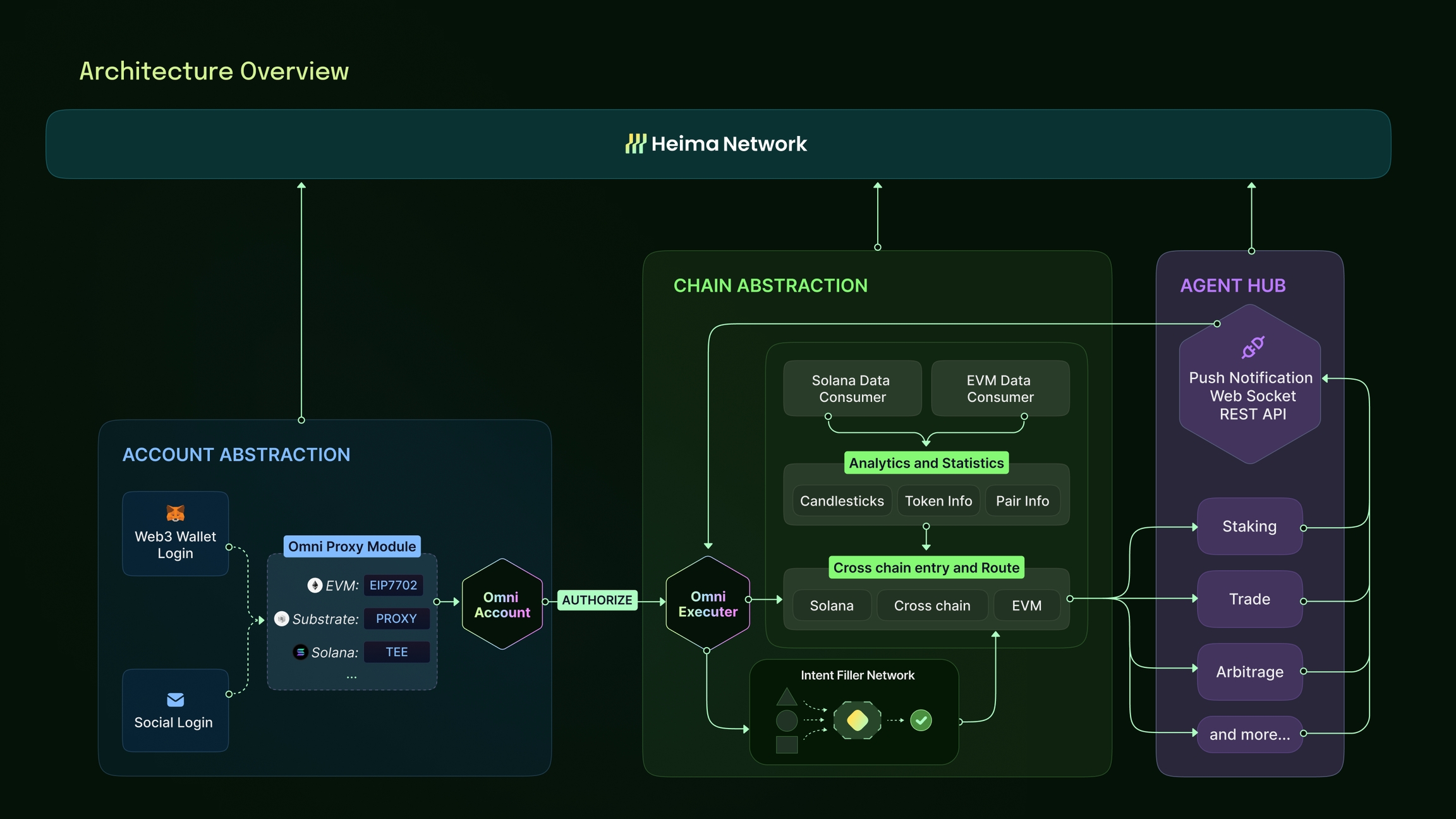 Heima is a full-stack coordination protocol designed to abstract complexity across accounts, chains, and agents. It introduces a unified omni-account layer, cross-chain intent routing infrastructure, a permissionless agent hub, and its programmable Layer 1 blockchain — all tied together by auditable execution and verifiable automation.
