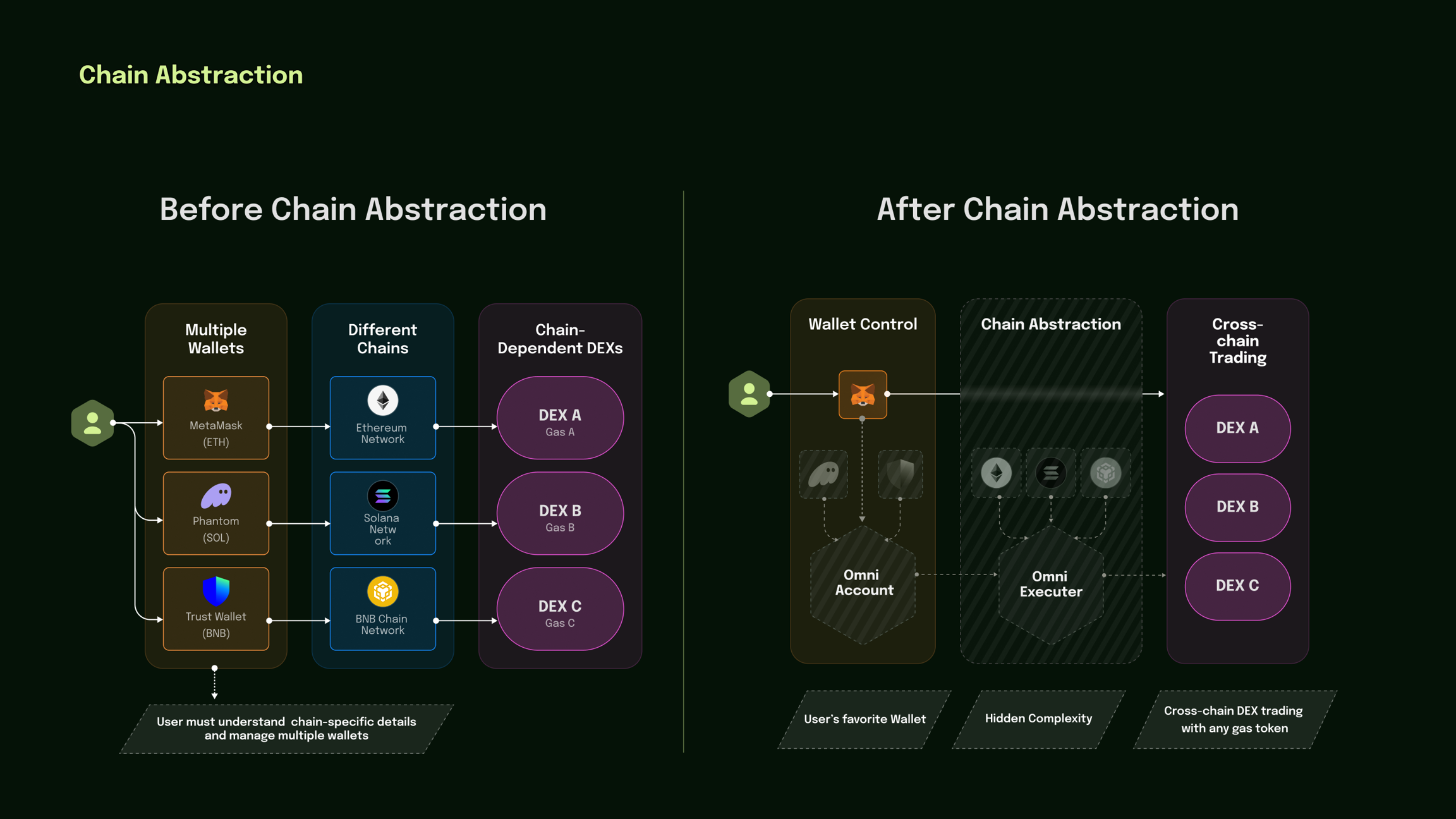 Users express desired outcomes rather than defining transaction steps. The system determines the optimal routing and execution strategy across chains.