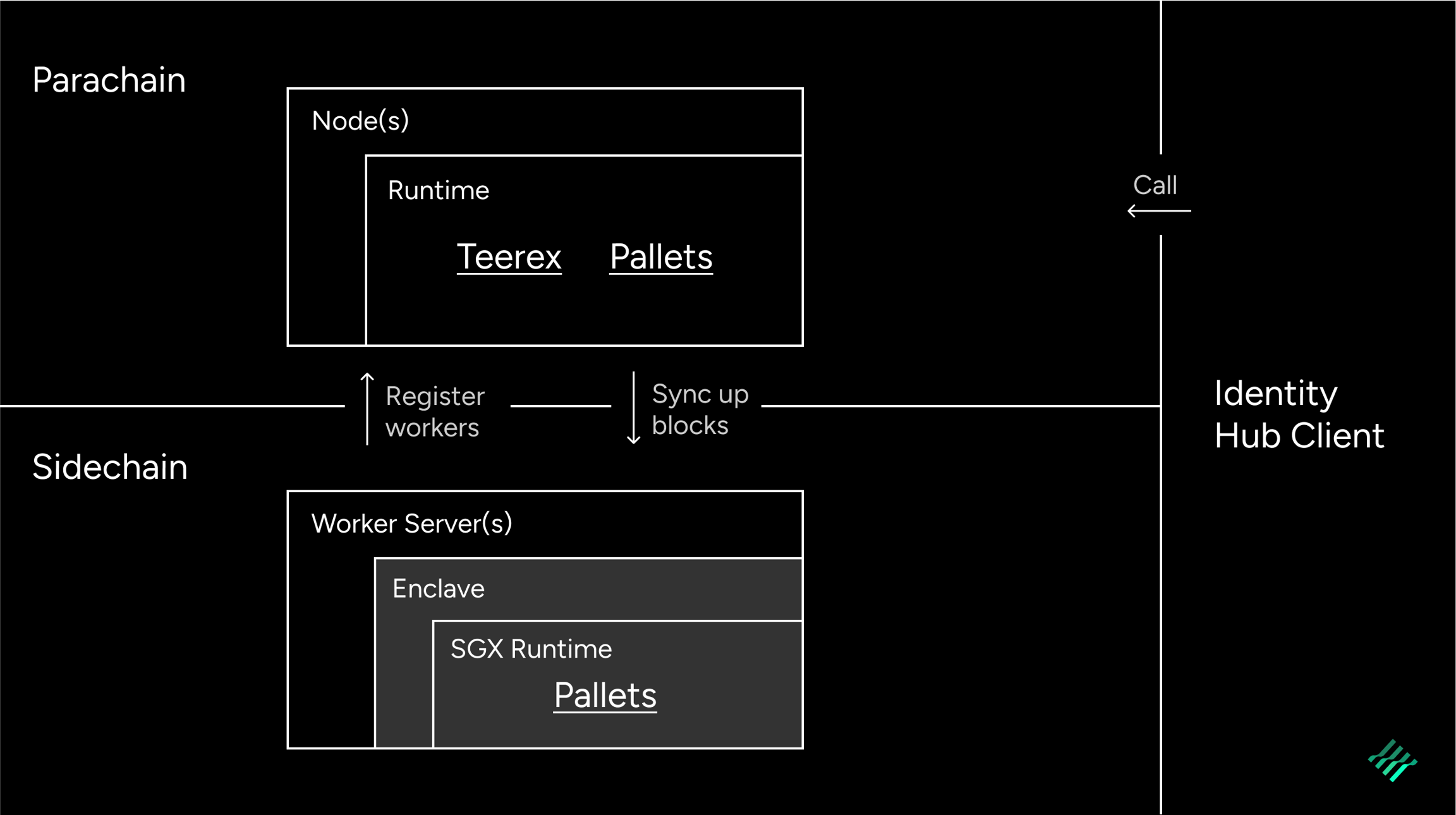 The client interacts with the parachain & sidechain - where calls made to the parachain are encrypted and opaque to invoke confidentiality. The content of the operation is only visible to the Client and the sidechain TEE (SGX, SGX workers/nodes, and SGX runtime).