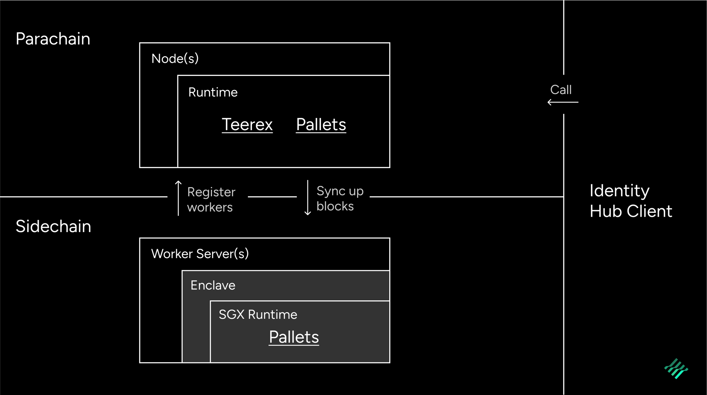 - Indirect invocation: Client encrypts SGX runtime call, sends to Teerex Pallet in parachain. The worker node syncs blocks, identifies call_work extrinsic, parses call from parachain, and dispatches them to SGX runtime.