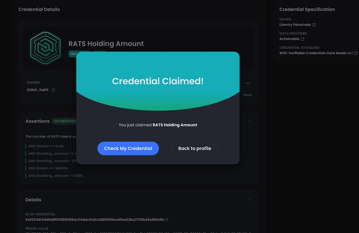 Back to the details page, your verified RATS Holding Amount credential is successful, and the score is displayed in the top right.