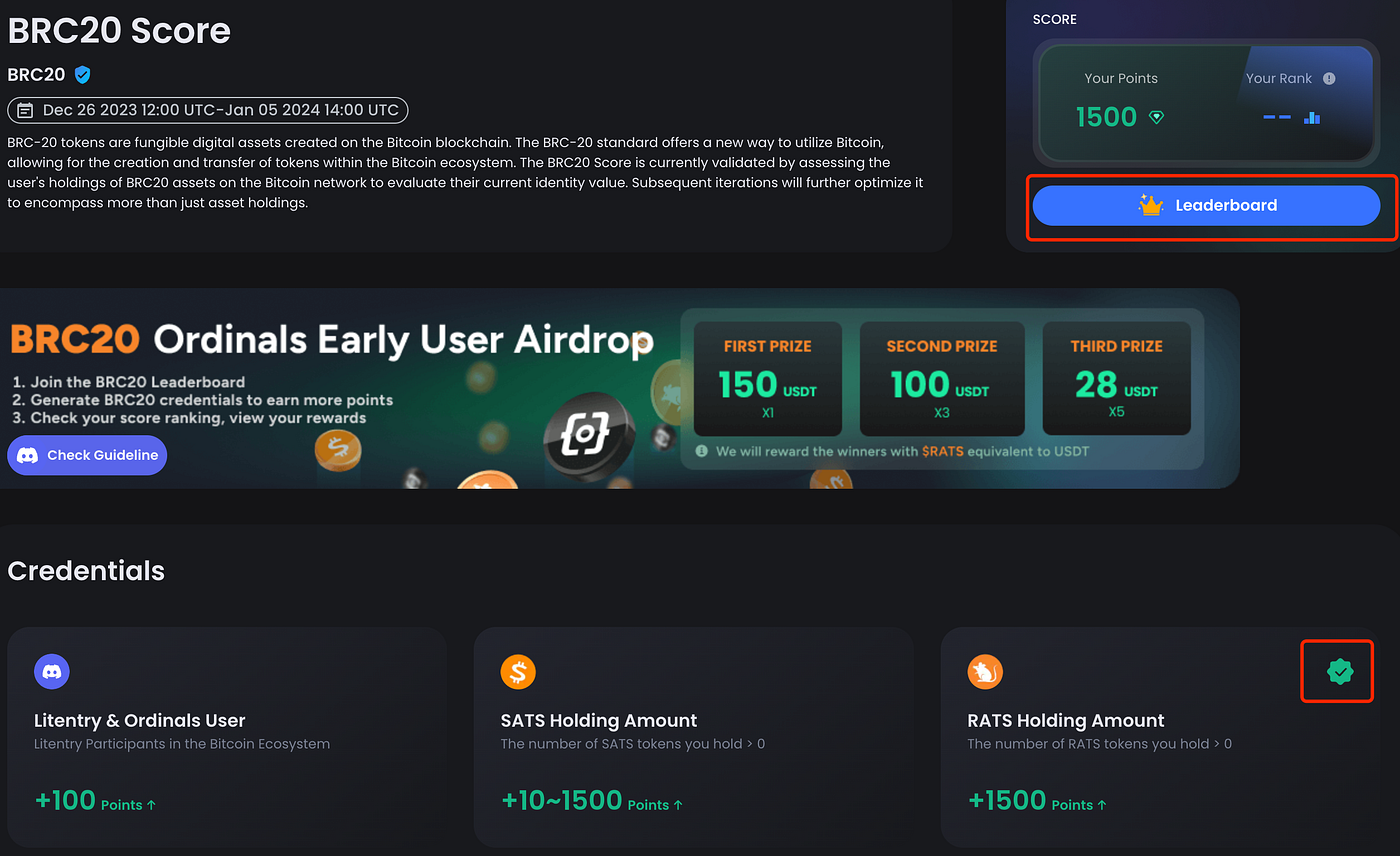 a. On the BRC20 Score details page, you can see the start and end dates of this campaign. The campaign runs from December 26, 12:00 PM UTC, to January 7, 12:00 PM UTC in 2024. b. Your score and leaderboard will be displayed in the top right. Click the Leaderboard button to join.