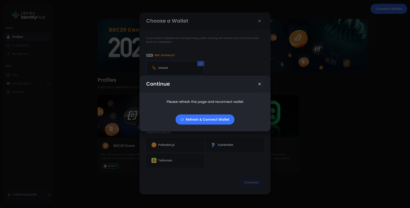 Connect your Unisat Wallet to IdentityHub. Link: https://idhub.litentry.io/profiles
