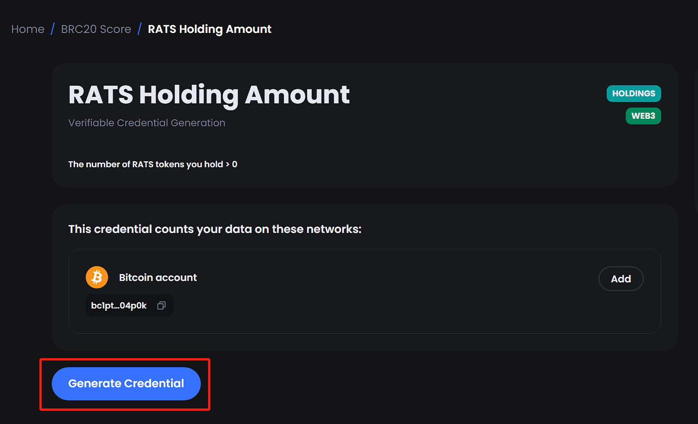 Taking rats as an example, click on rats to enter the RATS Holding Amount details page. Click “Generate Credential” to create your credential.