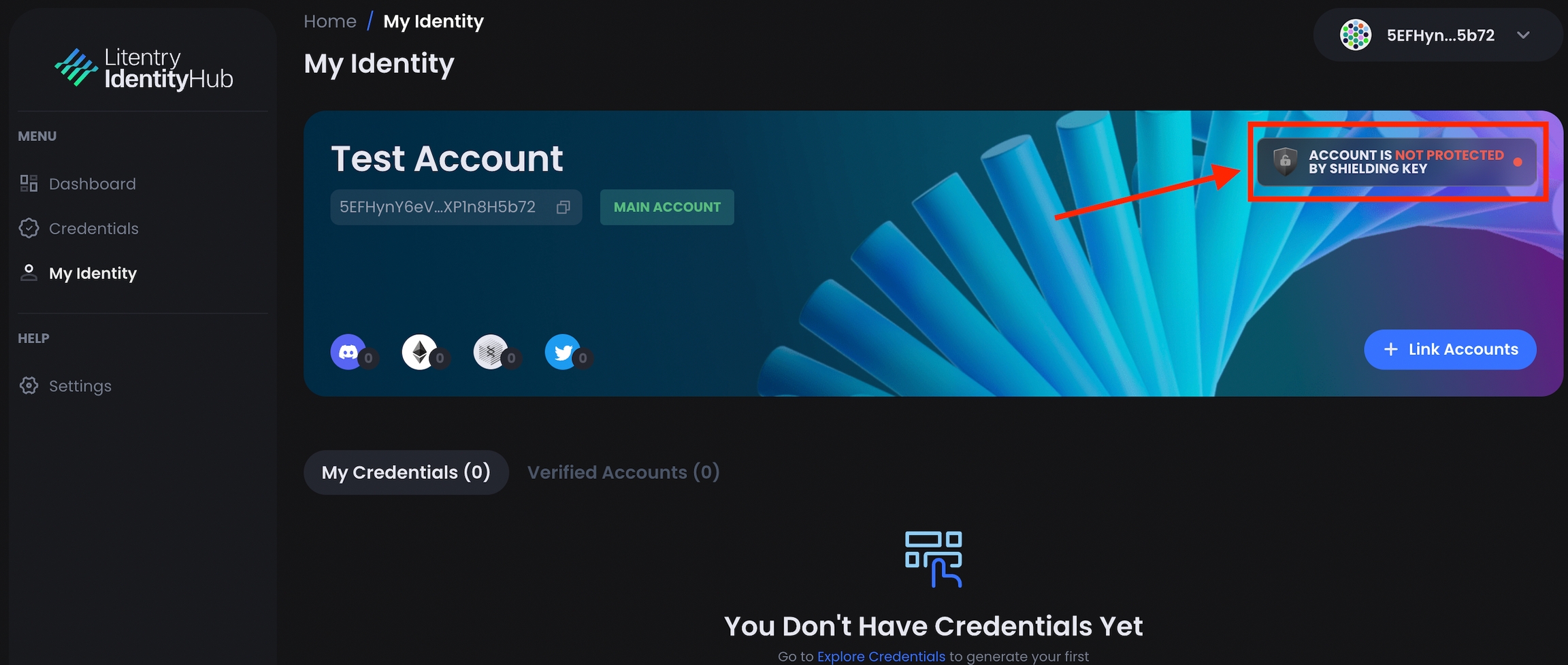 Once set, your “My Identity” page will have the “Account is Protected by Shielding Key Banner”