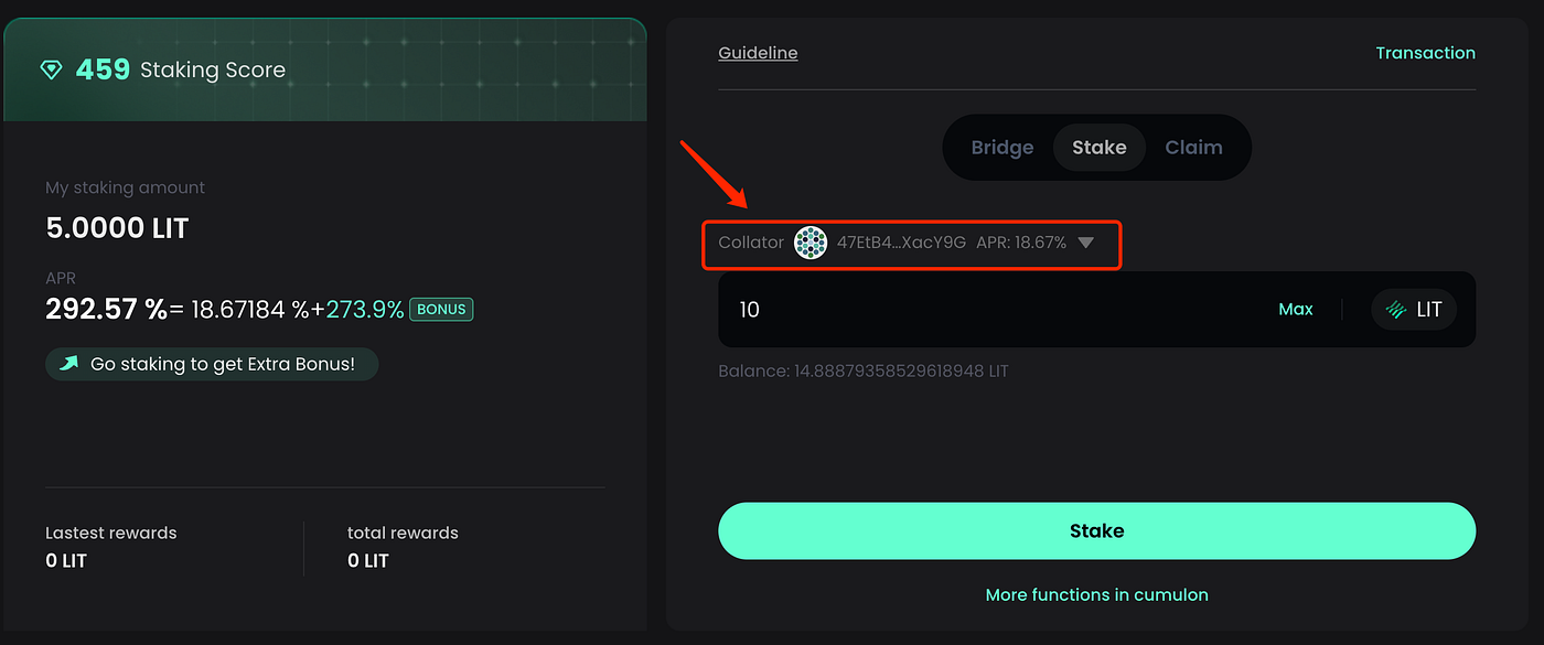 Node Selection: When choosing a node, remember that the displayed APR is based on the original staking pool, and selecting a different node will not impact the bonus APR from score rewards.