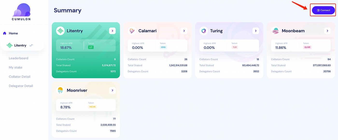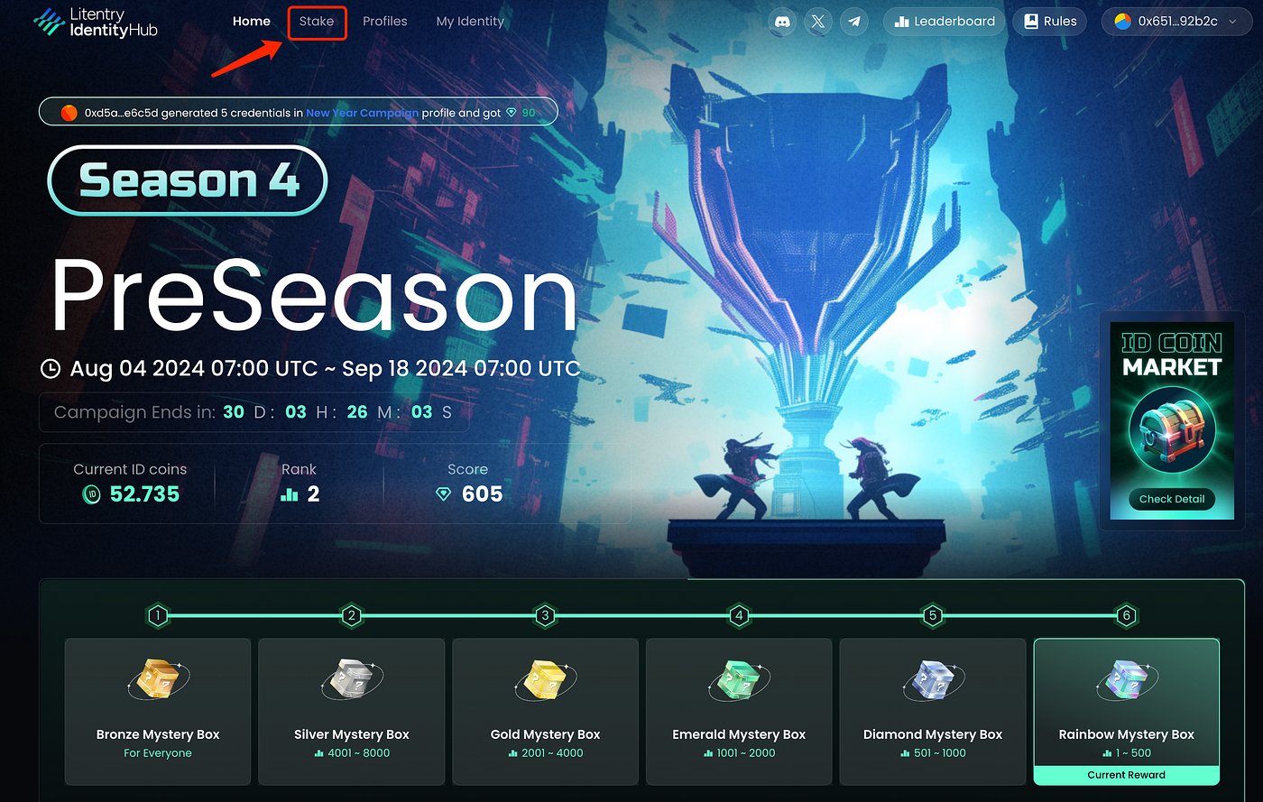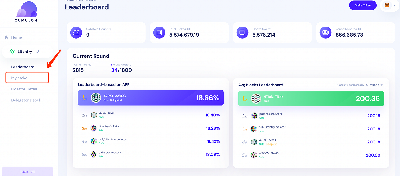 Once logged in, navigate to the top of the page and click on the “Stake” button to begin the staking process.