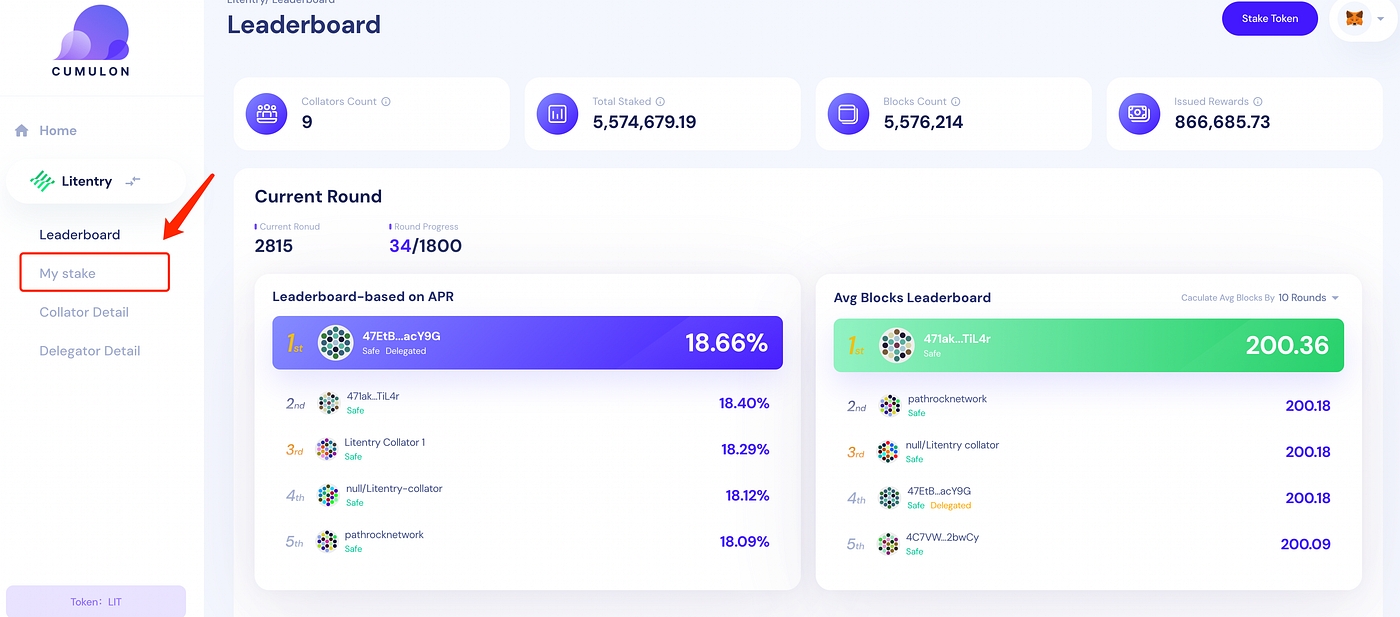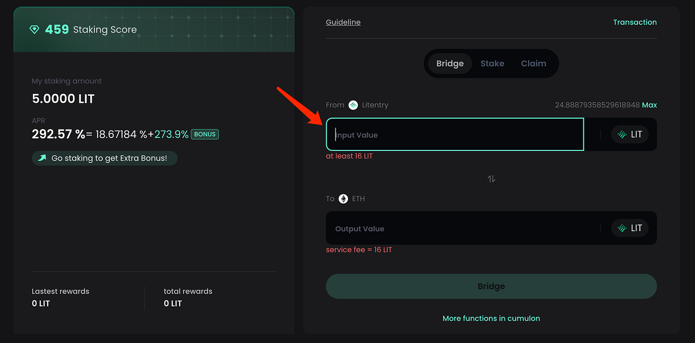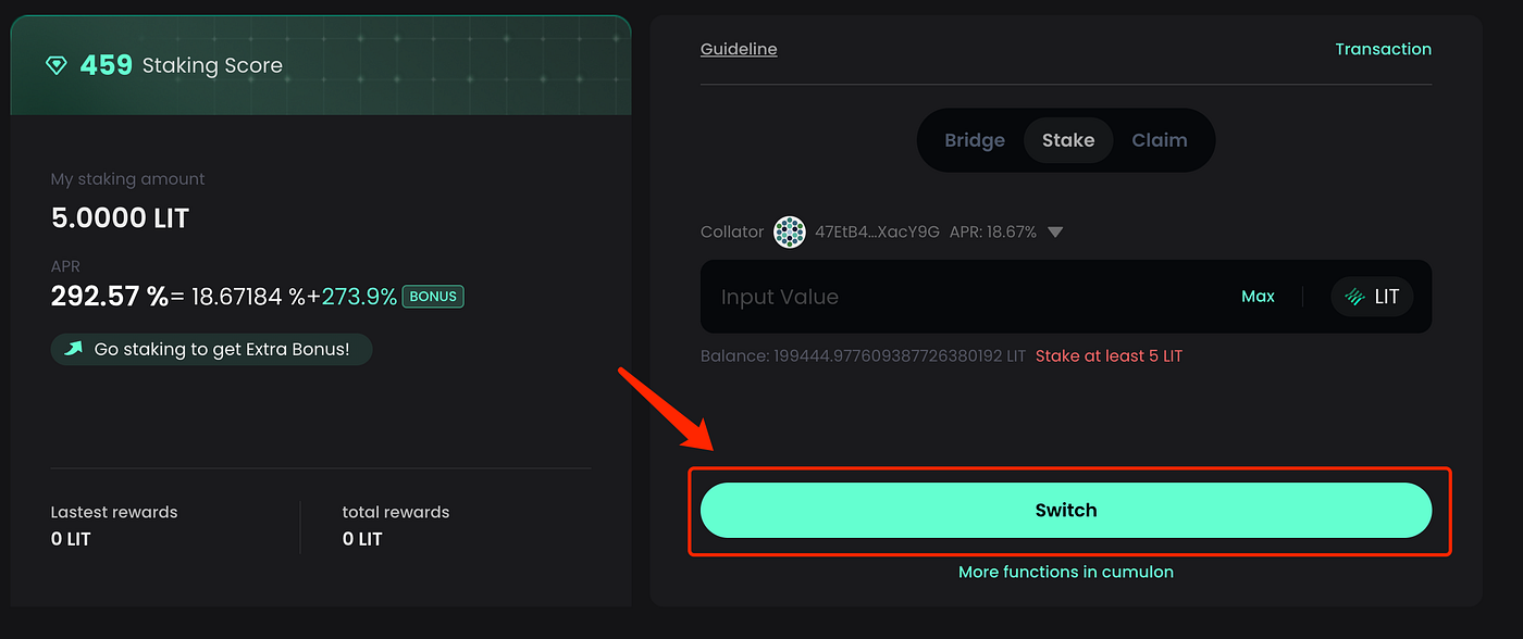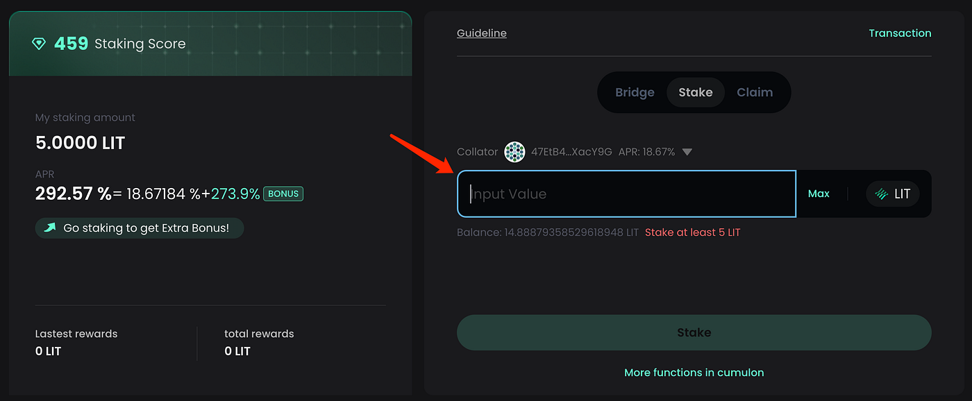 Input the amount you wish to stake. The minimum amount required is 5 LIT.